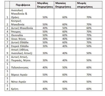 Τα ποσοστά επιδότησης αναπτυξιακού νόμου ορίζονται από 30% έως και 70% για μικρές επιχειρήσεις. Η ένταση της ενίσχυσης είναι το μέγιστο ποσό κρατικής ενίσχυσης που μπορεί να χορηγηθεί ανά δικαιούχο, και εκφράζεται ως ποσοστό των επιλέξιμων επενδυτικών δαπανών. Αναλυτικά τα ποσοστά του Χάρτη Περιφερειακών ενισχύσεων (Χ.Π.Ε), παρουσιάζονται για κάθε Περιφερειακή Ενότητα, στον ακόλουθο πίνακα: